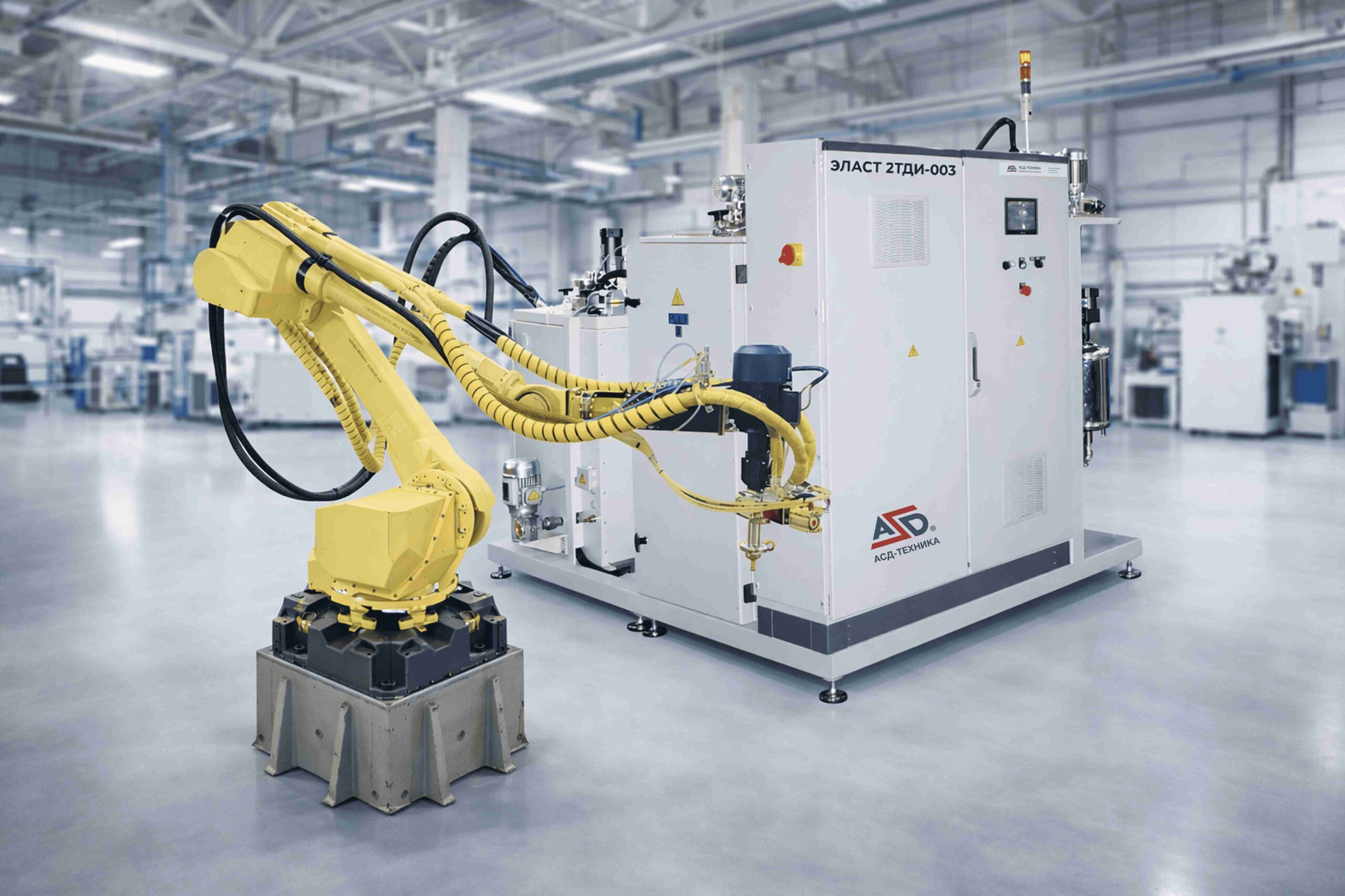 «АСД-техника» реализует проекты по роботизации операций с литьевыми и вспененными компаундами с применением дозирующих машин собственного производства и коботов AUBO или универсальных роботов,.