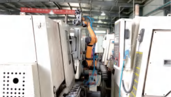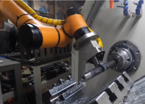 AUBO устанавливается между стеллажом с заготовками и станком. Он берет заготовку, помещает ее в патрон станка, дает команду на запуск программы. После завершения цикла обработки робот извлекает готовую деталь и кладет ее в зону готовой продукции, после чего цикл повторяется.